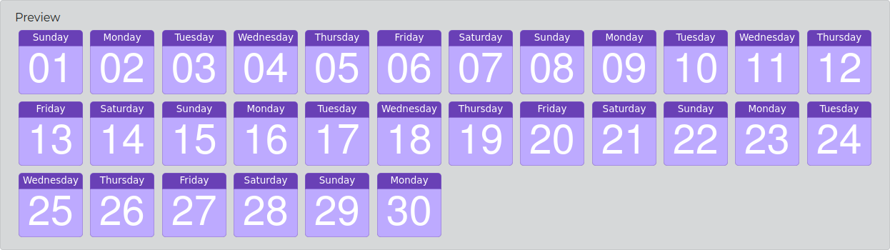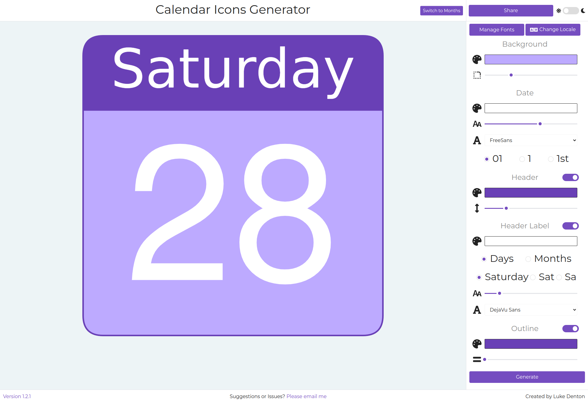 Want to make sure your icon design works for each day of the week? You can! After clicking the Generate button, the Generation modal will be shown, and there you'll find a preview of your icon design, for a whole months set of icons!